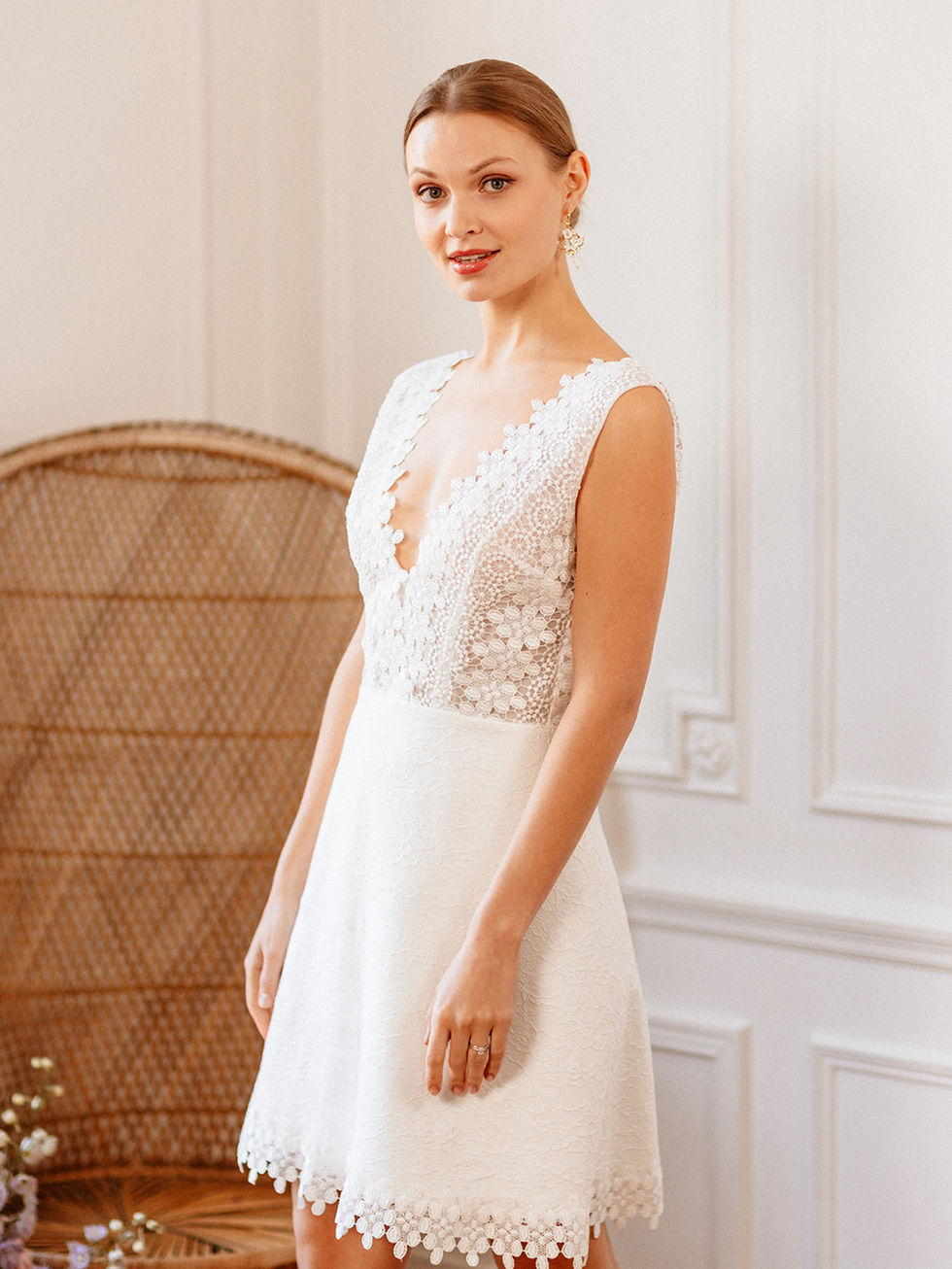 La robe Augusta est compose de 3 pieces, jupe longue et courte top en dentelle et ceinture 3 plis en option, pour celles qui cherchent une robe inspiration 1900 ou on aimé voir la dentelle dans toute sa splendeur, dentelle de Calais délicate, le top longue manche pour la cérémonie,on peut imaginer enlever la jupe longue au moment de la dance